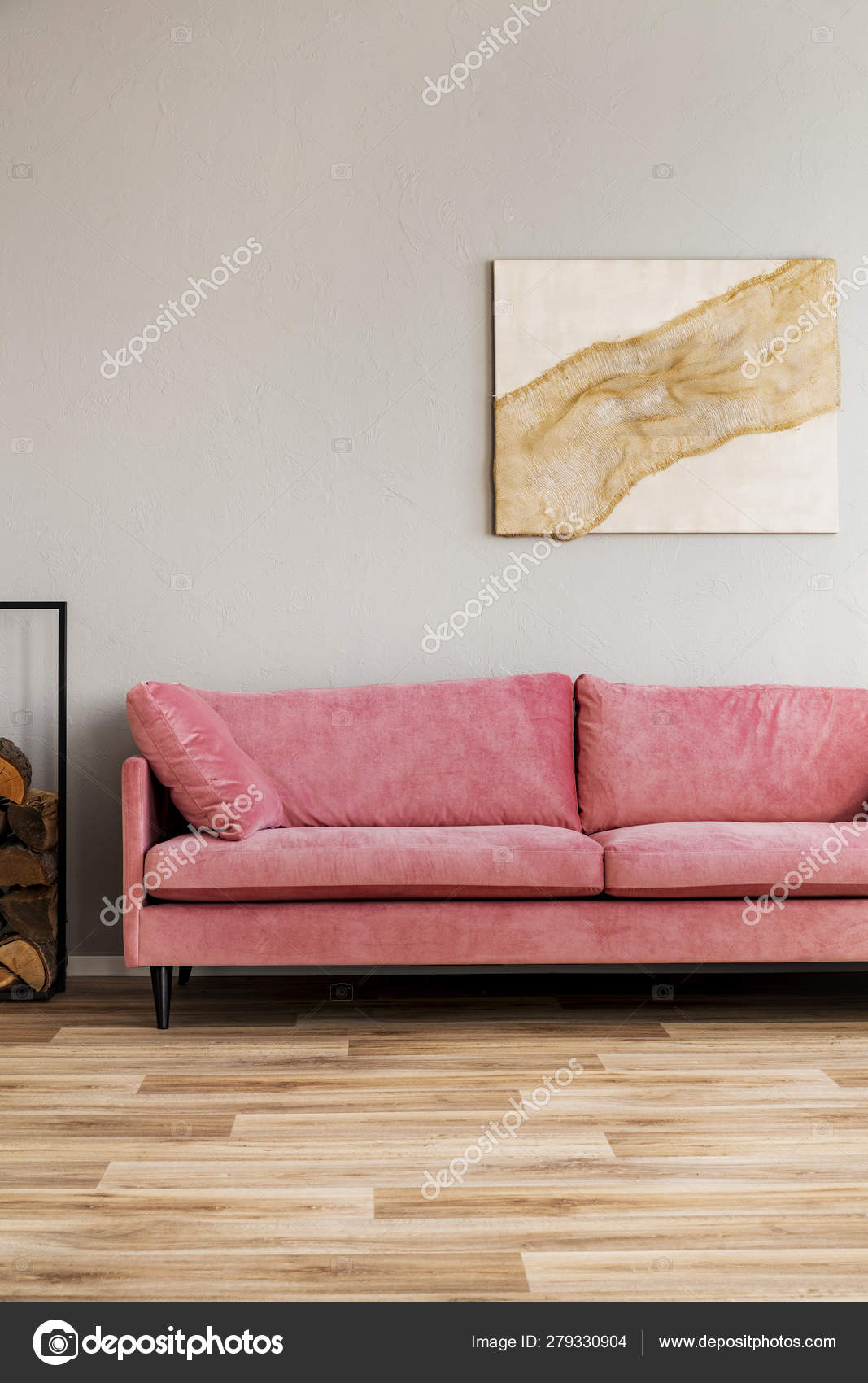 Pastel Abstract Painting On Beige Wall Behind Velvet Pink Settee