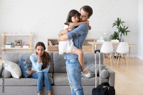 Unhappy Diverse Family In Living Room At Home Sad Father Hugs